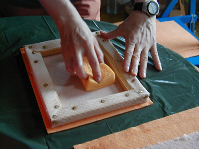 14 - Retournez et posez. Puis, à travers le tamis, épongez l'eau en appuyant fermement.